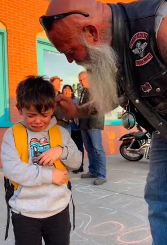 The biker turned slightly toward the boy and gave him a small nod. Not a grand gesture. Just enough to ground him in the moment.