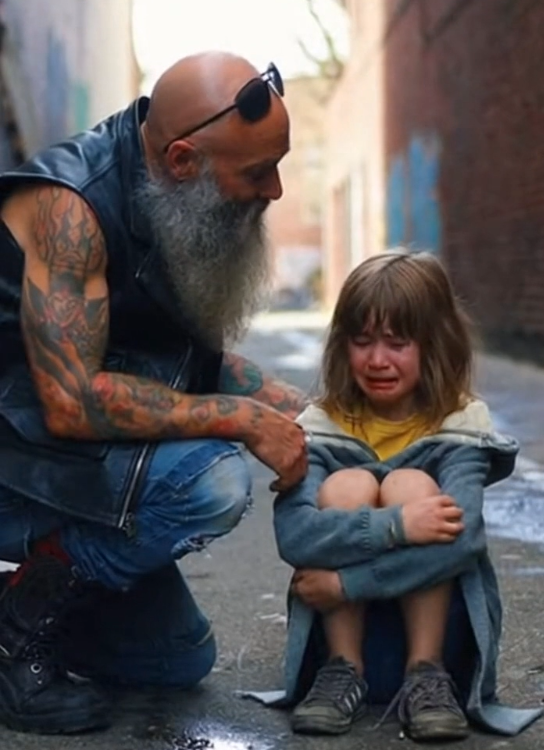 The biker crouched down so they were eye level. He didn’t rush. He didn’t interrupt her silence. When he spoke, his voice stayed steady.
