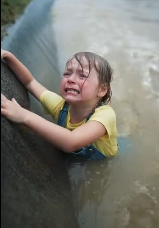 The water climbed higher with every second. Her small hands clawed at the slick walls, searching for something solid. Her cries were thin and terrified, nearly swallowed by the roar of the floodwater pushing past her.