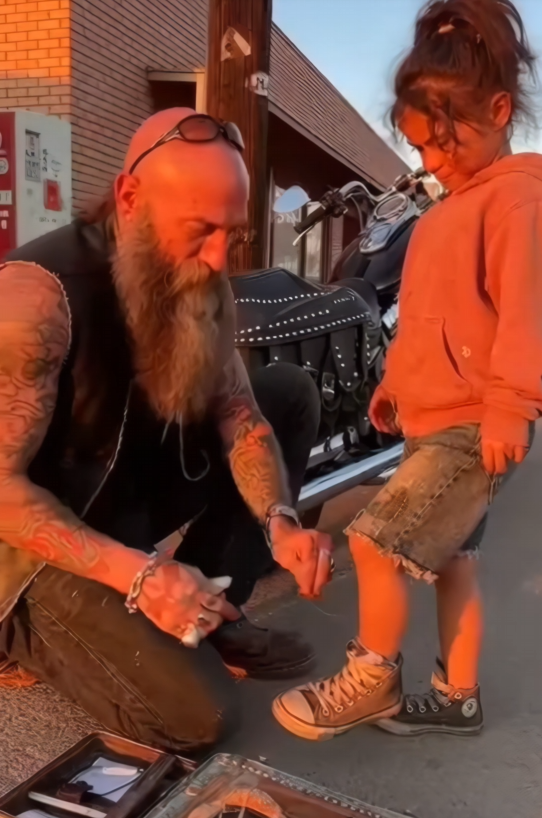 The biker crouched down so they were on the same level. He asked if he could take a look. No assumptions. No orders. Just respect.