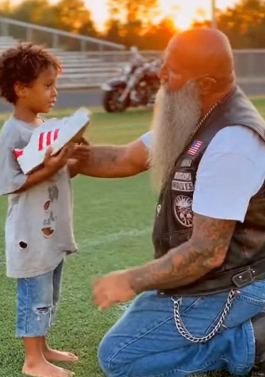 Mateo looked up when the tall biker approached. The man looked huge from where he sat—broad shoulders, heavy boots, and tattoos peeking out from beneath his sleeves.