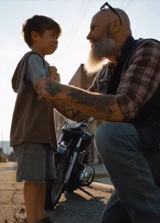 He’d been riding all day, his jacket worn and his boots covered in dust. He pulled over to the curb near the boy, the low rumble of his bike cutting through the noise of the city. For a moment, he just sat there, looking at the boy, trying to figure out the best way to break the silence.