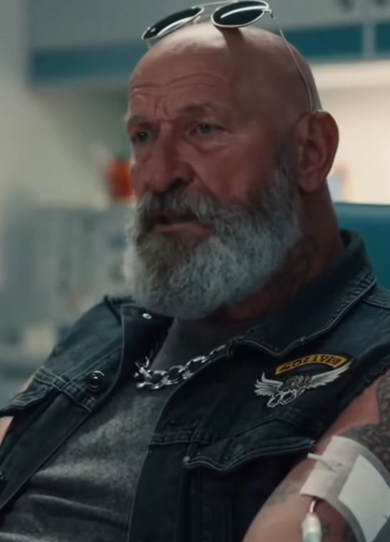 Minutes later, the biker sat inside the hospital, the noise of the street replaced by fluorescent lights and quiet urgency. He sat in a white chair that felt too small for his broad frame. Nurses moved efficiently, checking forms, confirming details, doing everything by the book.