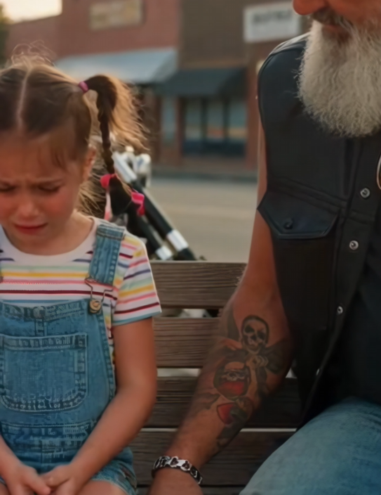 The biker slid off the stool and walked over. He didn’t tower over her. He didn’t crowd her space. He crouched down until they were eye level, meeting her gaze without forcing it.