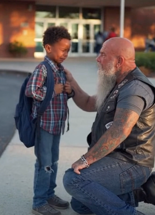 The boy looked up, surprised to see the tall biker standing nearby.