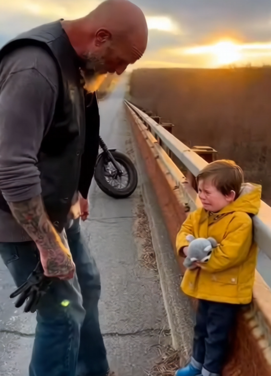 Each step mattered. The biker kept pace without leading, without pushing. When they reached the end of the bridge, the boy stopped and took a breath like he’d been holding it for a long time.