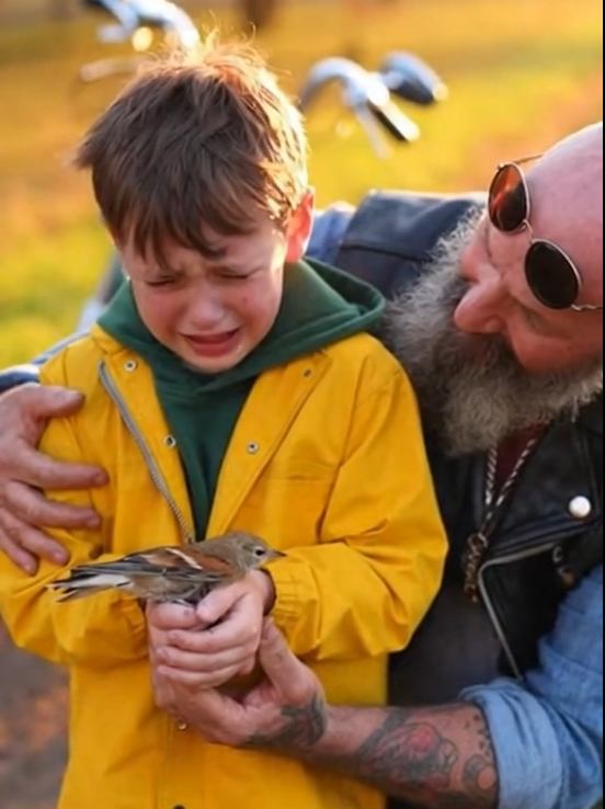 It was a bright, breezy afternoon when Jake decided to take a ride through the town’s outskirts. The air was warm, and the roads felt like a welcome escape after a long week. His mind was clear as he cruised, feeling the rhythm of the bike beneath him. As he passed the local park, he spotted something that stopped him in his tracks—a small boy, no older than eight or nine, kneeling beside a tiny sparrow on the ground.