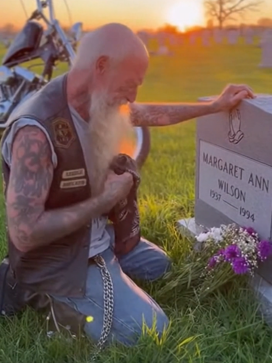 Jake had always been known as a man of action. With his rugged leather jacket, tattoos that told stories of a life lived on the edge, and a Harley that carried him across the open road, he exuded confidence and freedom. The roar of his bike was the soundtrack to his life, and the quiet moments in between rides were where he could reflect. But today was different. Today, he found himself standing at the crossroads of grief and remembrance, kneeling at his mother’s grave.