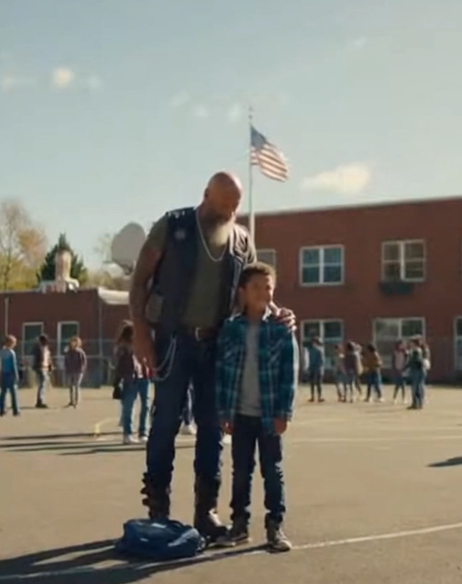 The biker stepped forward — not in front of the boy, but beside him.