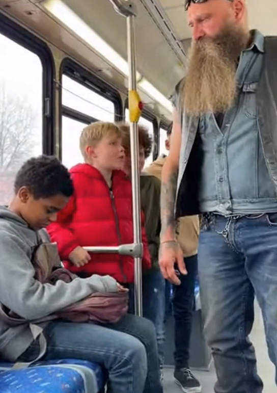 When the bus stopped to let a few kids off, the biker made a decision. He parked his motorcycle, removed his helmet, and calmly stepped toward the open bus door. The driver looked confused. This wasn’t part of the route.