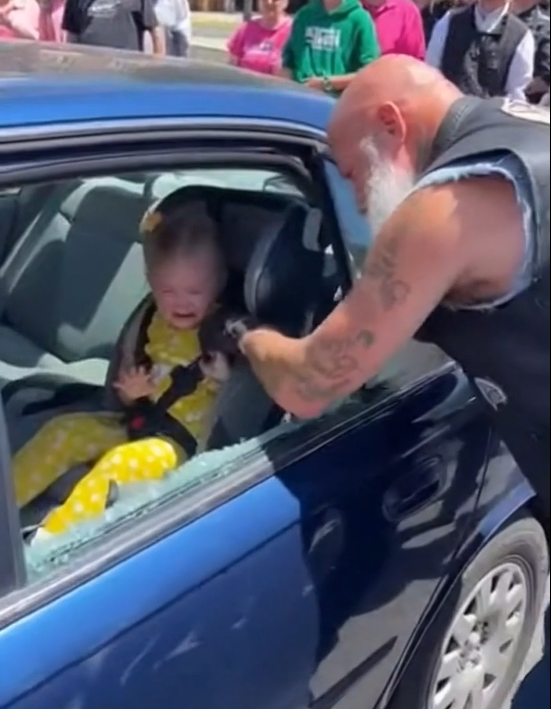 The biker moved instantly, brushing away broken shards with his sleeve so they wouldn’t cut the child. He reached inside, unlocked the door, and pulled it open wide.