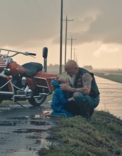 His bike rolled low and steady through the soaked streets, engine humming like it always did—reliable, grounded. He had ridden through storms before. He knew how to read the road.