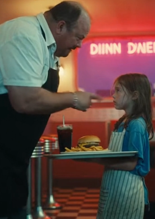 She wore an oversized apron that nearly brushed the floor, and her dark hair was tied loosely behind her head. In front of her stood the diner’s owner, his arms crossed tightly.