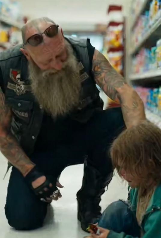 Leather vest, worn boots, tattoos that told stories of their own. He had seen life—real life. The kind that teaches you to read situations beyond the surface.