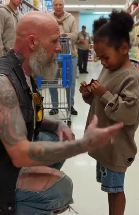 He had been standing near the back of the store, waiting patiently with a bottle of water and a sandwich in his hand. Leather vest. Boots scuffed by miles of road. The kind of presence people often judged before knowing.