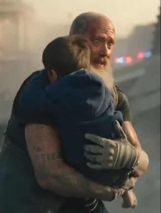 The child clung to him weakly, pressing his face into the biker’s chest like this was the first safe place he’d felt since the earth turned violent.