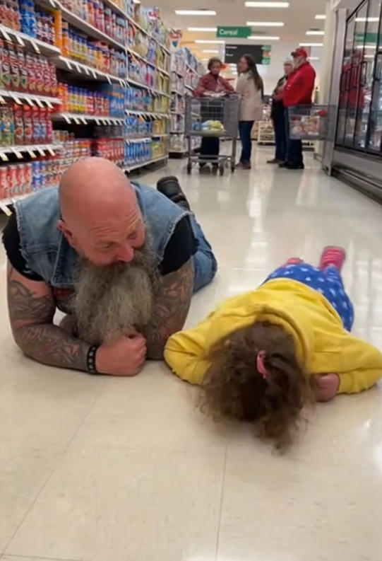 Right there in the middle of the aisle. Cold tile beneath him. Grocery carts rolling past. Leather vest pressed flat against the ground.