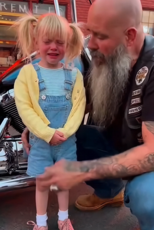 The biker stayed there a moment longer, speaking softly, as if time itself had slowed down. As if the world could wait until the child felt steady again.