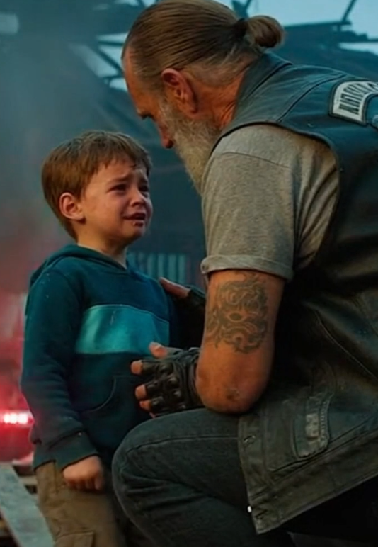 With careful guidance, the biker told the boy how to move. The door lifted just enough for him to squeeze through. The boy stumbled forward, legs shaking, and collapsed into the biker’s arms.