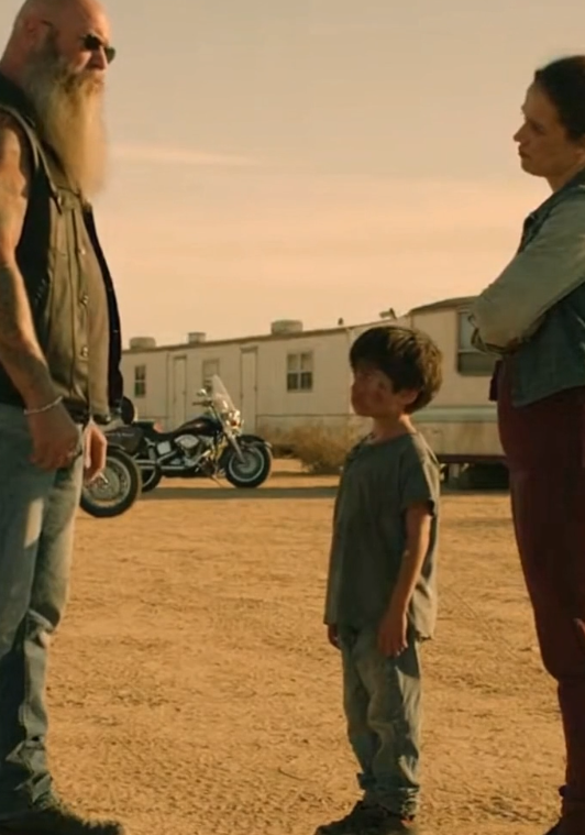The biker didn’t crowd the boy. He didn’t hover. He didn’t turn the moment into a scene. He stayed close—present, steady, and calm.