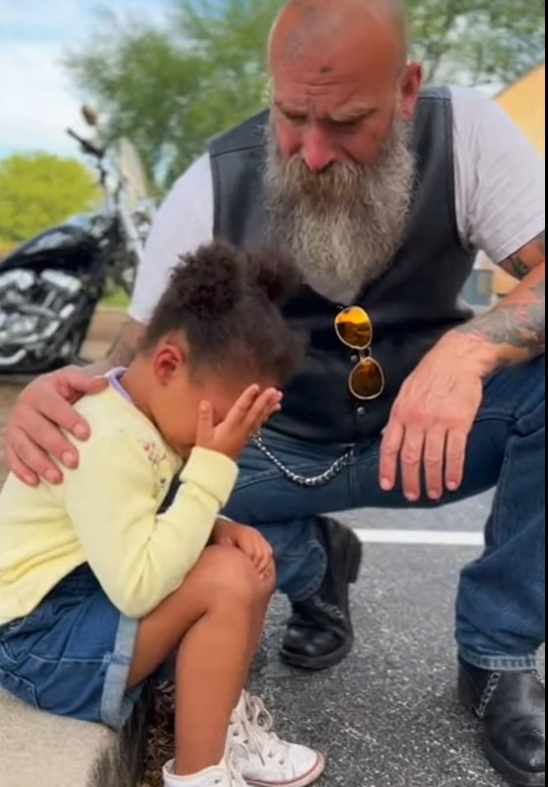 The biker didn’t rush in or demand attention. He leaned against his bike and watched quietly, like someone who understood that timing matters.