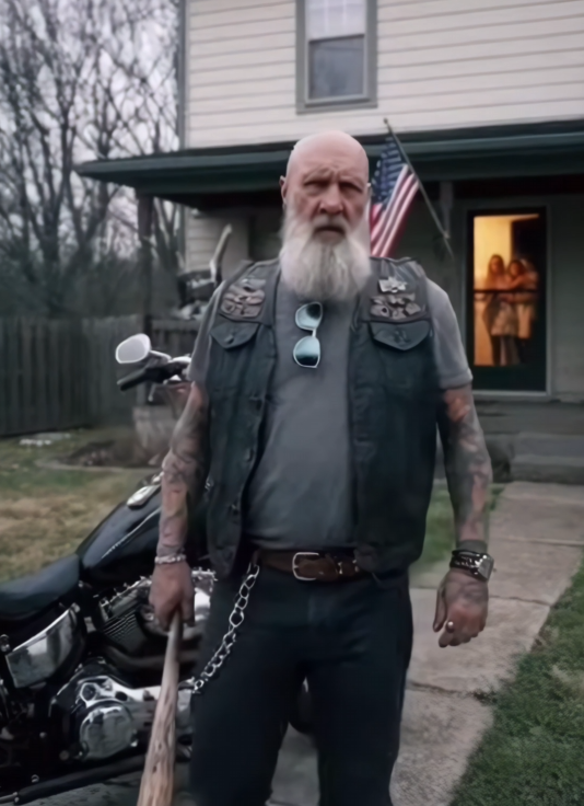A biker rolled up slowly and parked directly in front of the house. He didn’t block traffic. He didn’t make a scene. He positioned his bike in front of the door like a barrier with purpose.