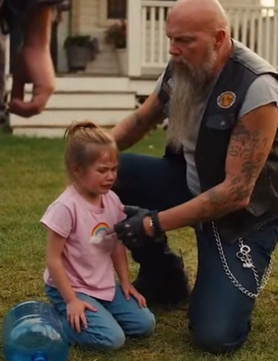 A biker swung off his motorcycle and removed his helmet. He didn’t rush. He didn’t shout questions. He walked toward the girl with steady steps, boots firm against the ground, eyes focused on one thing only.