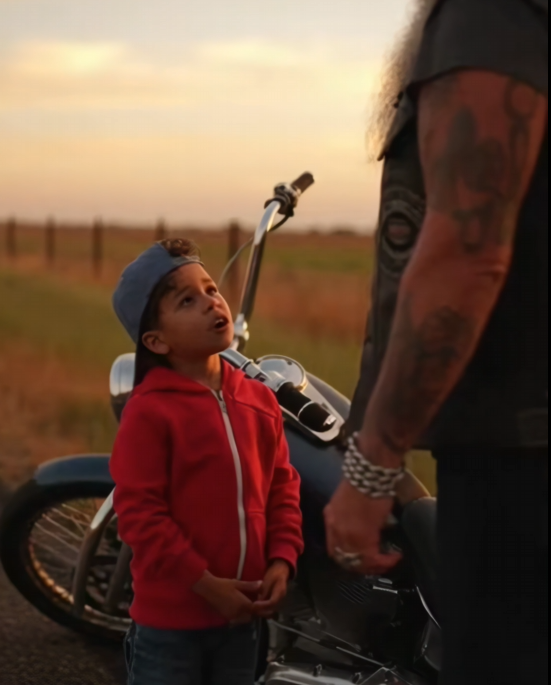 The biker stood up slowly, blinking once like dust had gotten in his eyes. He clapped the boy lightly on the shoulder—not rough, not performative. Just human.