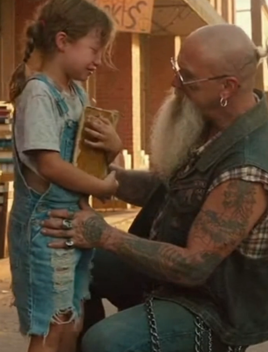 When the biker handed the book to her, she held it like it was fragile and powerful at the same time. Her fingers traced the cover slowly. Carefully. Like she was learning how to hold something beautiful without asking permission first.