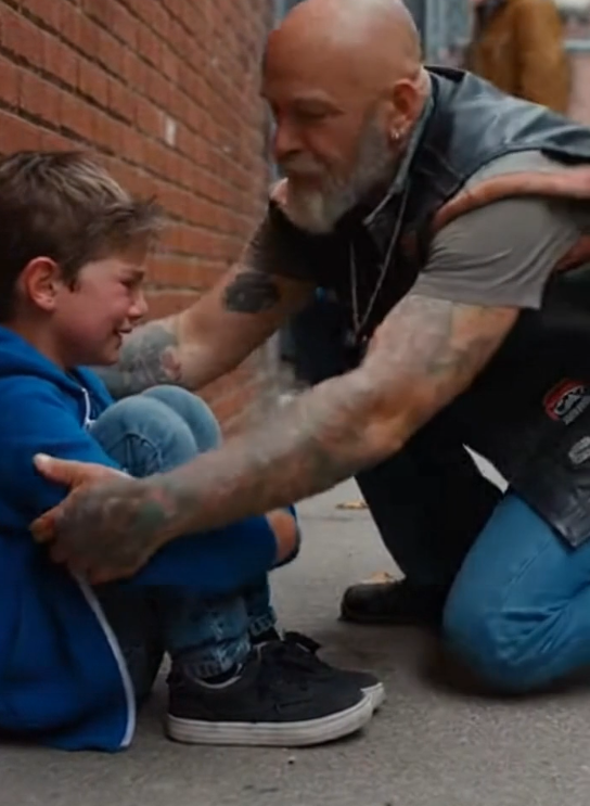 The boy followed, heart racing but breathing easier with every step away from the shouting. The biker lifted him onto the seat carefully, steady hands making sure he felt secure. Then he positioned himself between the child and the noise, like a wall that didn’t need to raise its voice to be strong.