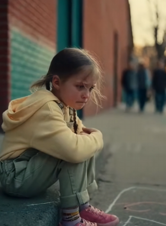 She kept her hands folded tight in her lap, fingers pressed together so hard her knuckles looked pale. Her eyes stayed locked on the tabletop, tracing old scratches in the wood. Every time an adult nearby raised their voice, even just laughing too loud, she flinched. When someone asked her a question, she nodded quickly and went quiet again.