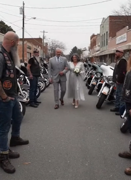 As the couple drove slowly down the street, the bikers rode alongside them, forming a respectful escort. They didn’t crowd. They didn’t lead. They guarded the space, making sure nothing interrupted it.