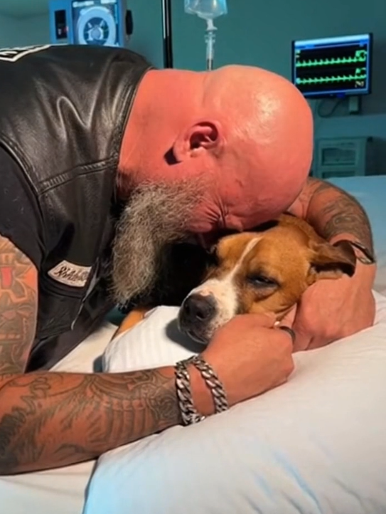 The dog let out a faint sound and shifted his head, pressing weakly into the biker’s chest. It was barely noticeable to anyone else in the room.