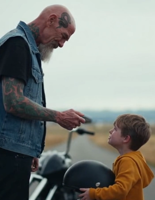 No sudden movements. No towering posture. He didn’t rush or crowd the boy. Instead, he reached up and slowly removed his helmet. The sound of it coming free felt gentle, almost ceremonial. Beneath it was a face shaped by years of sun, wind, and miles on open roads.
