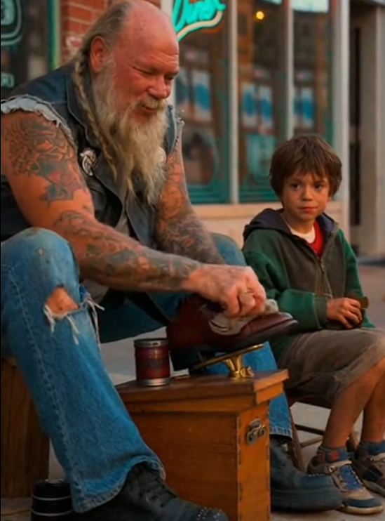 A biker in a leather vest, boots dusty from miles of road, sitting on the curb polishing his own shoe beside a kid most people pretended not to see. It wasn’t loud. It wasn’t dramatic. But it was impossible to ignore.