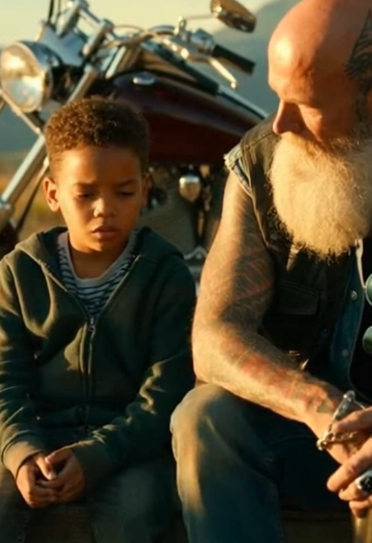 The biker gently lifted a hand. Not to stop the boy—just to pause him.