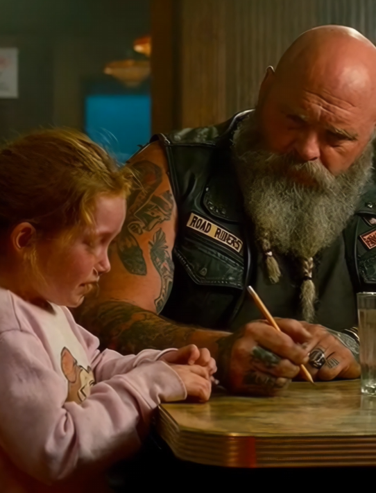 One of the bikers—older, calm, grounded—sat down on the curb so he wouldn’t tower over her. He didn’t cross his arms. He didn’t stare. He just listened.