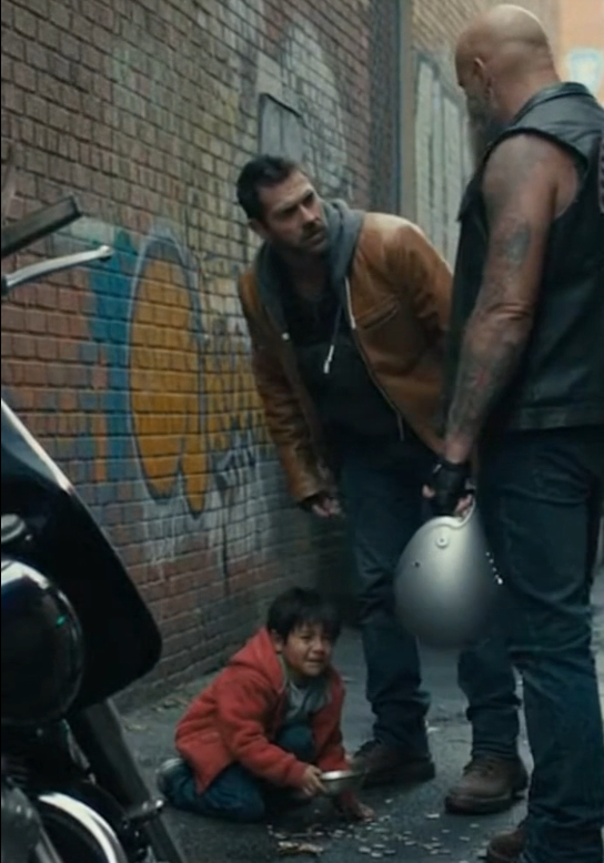 The biker knelt again and handed the bowl back to the boy. Before standing, he slipped a few bills inside—not making a show of it, not drawing attention.