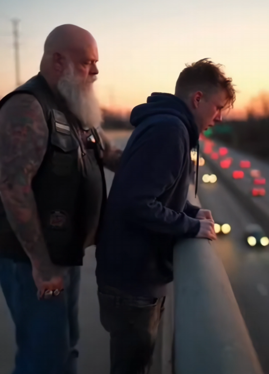On an overpass, the noise never really stops. Engines hum like a restless heartbeat. Tires hiss against concrete, carrying thousands of lives forward at once. The city keeps moving, indifferent to who is ready and who is not. It was there, above that endless motion, that a group of American bikers noticed something that didn’t fit the rhythm. A man stood near the guardrail, hands wrapped around cold metal, body angled just a little too close to the edge. Below him, traffic blurred into streaks of light and steel.