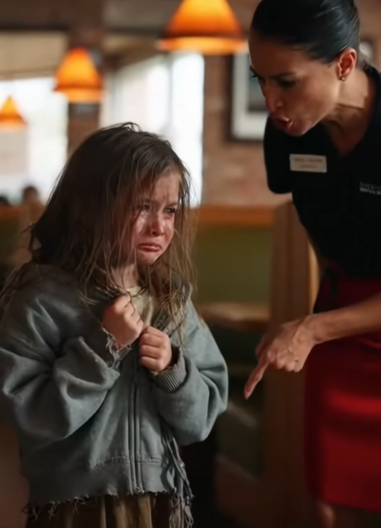 At a corner table stood a little girl, shoulders hunched, hands clenched at her sides. Her clothes were worn. Her hair tangled. She hadn’t meant to draw attention. She just needed a place to stand for a moment. But attention found her anyway.