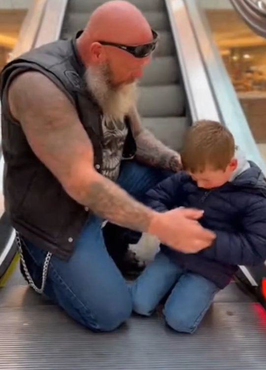 Not every act of courage looks loud or dramatic. Sometimes it looks like a biker standing still on a broken escalator, blocking fear with his body and guiding a child back to solid ground. In moments of panic, strength isn’t about force. It’s about presence. And for one boy in a busy mall, that presence made all the difference.