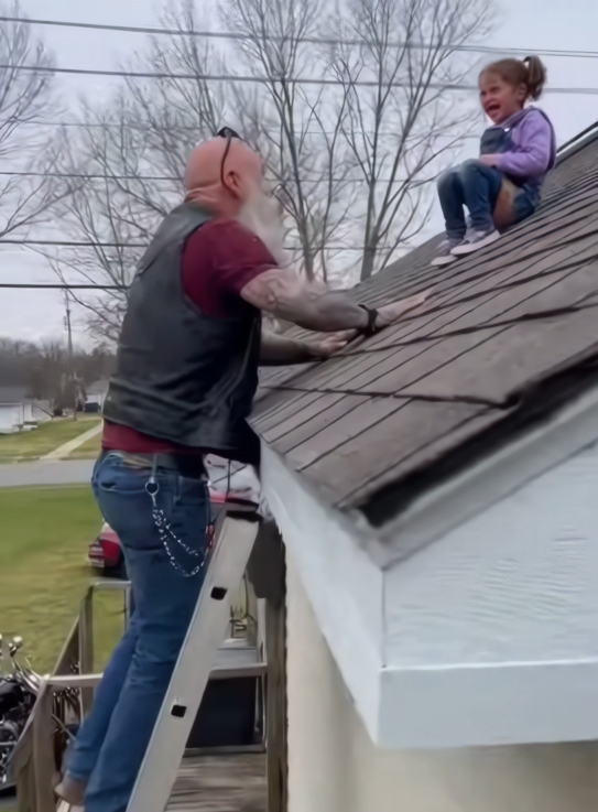 The girl started climbing down, hands shaking, feet slipping on wet rungs. She focused hard, eyes locked on the biker below her.
