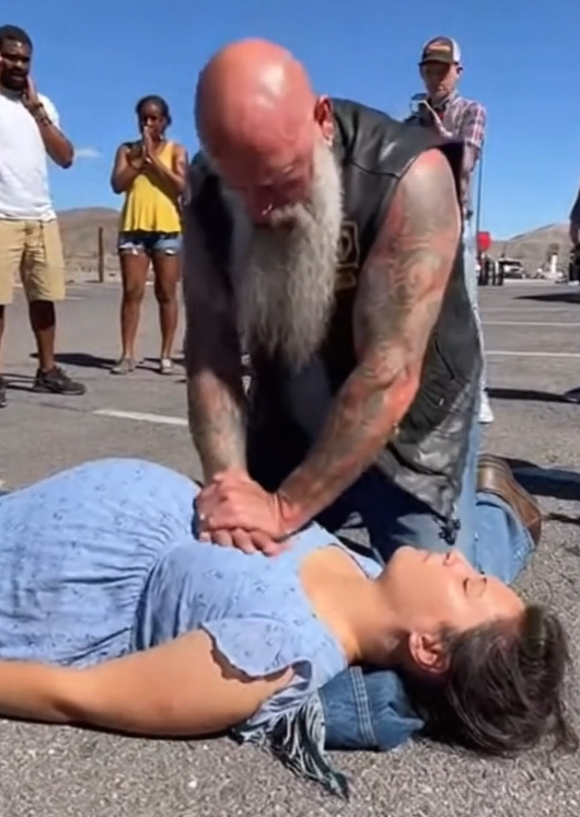 In the middle of a sweltering street, a tattooed biker reminded everyone watching that helping someone doesn’t require approval, polish, or a certain look.