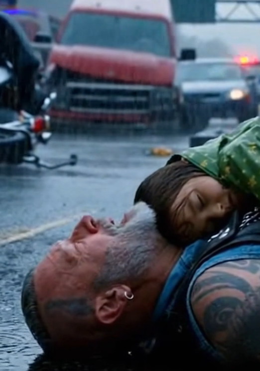 His daughter lay against his chest, her body too still, too quiet in a world that refused to slow down. Her hair clung to her face, soaked by rain that mixed with blood he tried to wipe away with shaking hands. He pulled her closer, holding her like warmth alone might change the ending.
