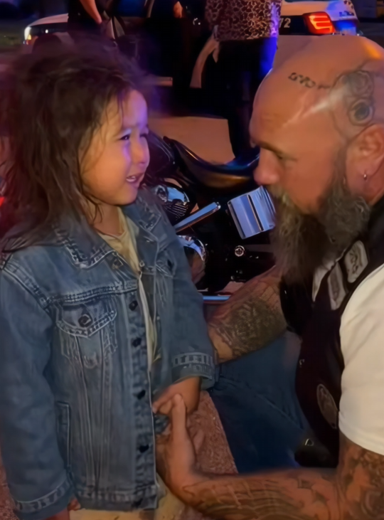 The biker closest to her paused. He had the look of someone who had spent years on the road—broad shoulders, leather jacket worn thin by time and weather, face marked by experience rather than softness. But instead of standing tall, he crouched down so they were eye level.