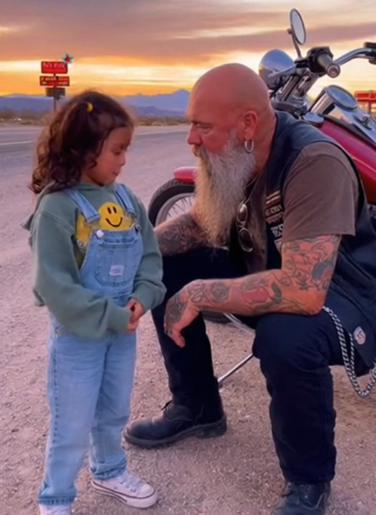 The biker shook his head, not angry, not rushed—calm but firm in a way that felt steady instead of scary.